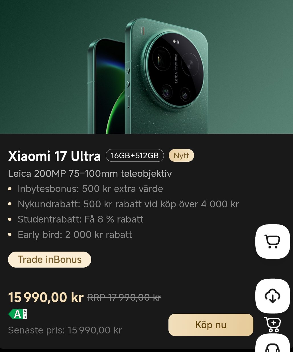 Det framgår att telefonen kommer kosta från 17 990 kronor med 16 GB RAM och 512 GB ROM. För den som vill ha 16 GB RAM med 1 TB minne så är det istället ut som att telefonen kommer kosta 19 990 kronor. Något som bör noteras är att Xiaomi just nu kör en kampanj så de som förköper modellen just nu får 2000 kronor rabatt, något som innebär att de som vill köpa modellen med 512 GB minne kommer behöva lägga ut 15 990 kronor. Däremot ser det inte ut som att samma kampanj gäller för modellen med 1 TB minne.